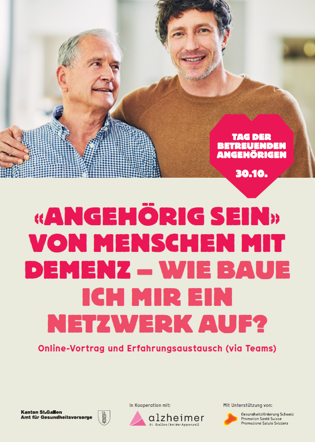 Die Pflege und Betreuung von Menschen mit Demenz im eigenen Umfeld ist oft herausfordernd und verlangt viel Kraft. Im Online-Vortrag erhalten Sie praktische Anregungen, wie Sie ein unterstützendes Netzwerk aufbauen.